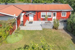 Välutrustad stuga på stor, delvis insynsskyddad tomt. Från huset och tomten ser man en glimt av have...