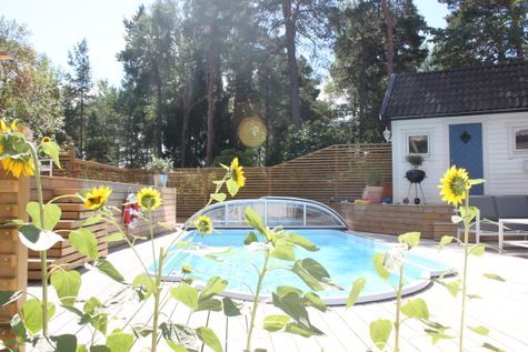 Tomt: insynsskyddad naturtomt (1500m2) med stor altan (ca 100m2) i syd och västläge. Uppvärmd pool i anslutning till huset. Kräver viss tillsyn.