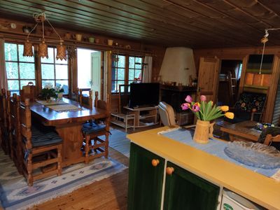 I storstugan finns soffgrupp, öppen spis, tv med internetanslutning och marksända kanaler och samt bredband med wifi,