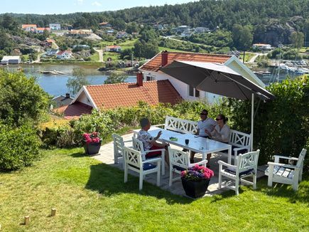 Havsnära läge i Kungsviken på Orust med utsikt över viken och 100 Mbit WiFi. 150 meter till välordnad badplats med brygga, strand, skärgård, klippor och hopptorn. Härlig solig tomt. I huset finns 1 vardagsrum med (TV + Google Chromecast, Apple TV), 2 sovrum, 1 kök i anslutning till matplats i glasveranda med utsikt över viken. På tomten finns även en friggebod. Totalt finns 6+4 bäddar med följande fördelning: Sovrum #1 på 2:a vån med 2 bäddar, sovrum #2 på 2:a vån med 2 bäddar (möjlighet att ställa in 2 extra sängar), vardags-/TVrum på vån 1 med 2 bäddar (bäddsoffa). "Sovrum #3" i friggebod med familjesäng/våningssäng. Bottenbädden är 200cm x 120cm, och överbädden är 200cm x 80cm.