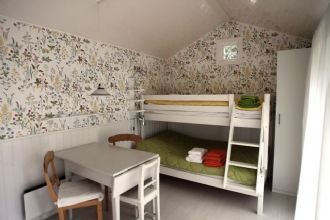 Röd stuga varsamt renoverad nu även vinterbonad plus friggebod i Strandbaden, liten by norr om Höganäs, i natursköna kullaberg.
