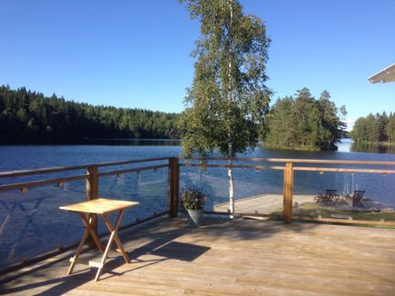 Egen stor badbrygga med vedeldad bastu, badtunna och badstege finns för den badsugne. Vill man kan man duka till fest på bryggan – ett härligt sätt att njuta efter en dag fylld av aktiviteter.
