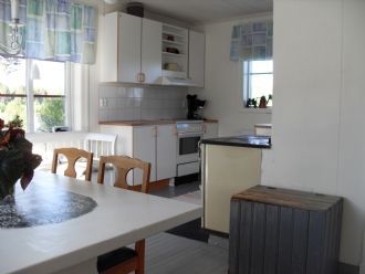 Gårdshuset är helt nyrenoverat 2015. Det är ljust och fräscht. I köket har vi valt att behålla den gamla vedkaminen, för charmens skull. Självklart finns det en vanlig spis för matlagning.