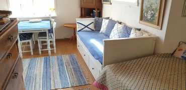 Mysig stuga i äkta skärgårdsstil i härlig trädgård, toppenläge i hamnen. Nära till buss, Hemköp, småaffärer, kaféer och badplats. Ägarna är väldigt trevliga och tillmötesgående. Tillbringade 3 underbara veckor där. Hyr gärna igen.