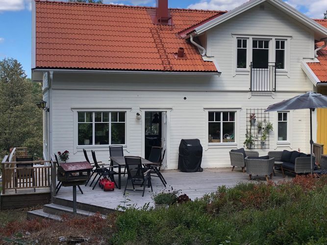 Modern villa (2016) i 1 1/2 plan på Resarö i Stockholms Skärgård. Solig och insynsskyddad naturtomt.