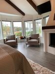 Masterbedroom är ett fantastiskt rum med härlig rymd öppet i nock och med stora fönster i burspråk mot vattnet. Sköna fåtöljer, en lyxig dubbelsäng 180 x 200 cm och en stor eldstad (ej i bruk).