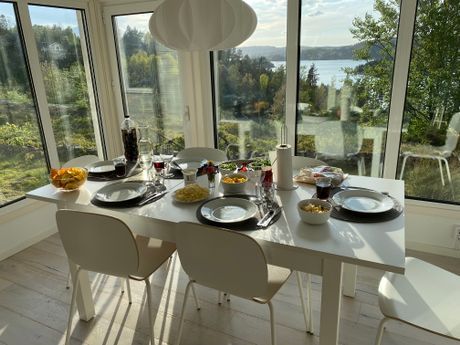Huset har en öppen planlösning mellan kök, vardagsrum och matplats. Från matplatsen mot väster har man en underbar havsutsikt via panoramafönster. Köket är utrustat med diskmaskin, induktionshäll, ugn, mikro, kyl, frys och kaffebryggare.