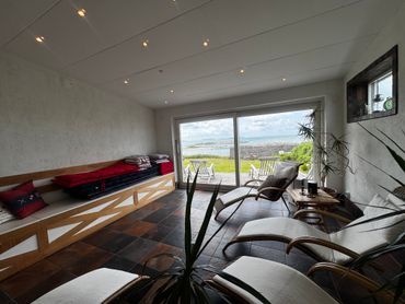 Njut av den fantastiska relaxavdelningen med jacuzzi, bastu och havsutsikt – en perfekt plats att koppla av efter en dag vid havet. Det stora och ljusa allrummet har öppen spis och panoramautsikt som skapar en mysig atmosfär för kvällarna.
