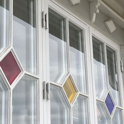 Glasverandan och vardagsrummet förbinds med två trappsteg och mellan de två våningarna finns en så kallad norsk lofttrappa. Därför är stugan tyvärr inte lämpad för de helt små barnen eller personer som har rörelsehinder.