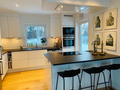 På entrévåningen finns ett fullt utrustat kök med matplats där man kan sitta 10-12 personer. I anslutning till kök/matplats finns utgång till den stora altanen och trädgården. På altanen finns flera sittgrupper och i trädgården studsmatta och en stor plan gräsmatta som inbjuder till lek.