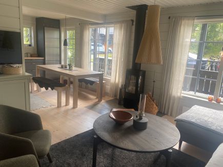 Kök/allrum: Välutrustat kök med kombinerad varmlufts- och microvågsugn, induktionshäll och diskmaskin. Matplats för 6 (max 8) personer. Sällskapsdel med hörnsoffa, TV och braskamin.