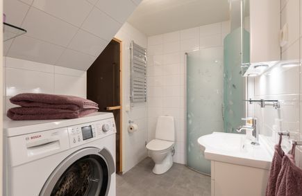 Dusch, bastu och toalett är renoverat 2020 och tvättmaskin finns inne vid toalett/dusch.