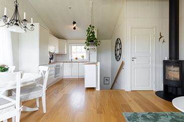 Fullt utrustat kök med diskmaskin och mikro, stort kök och allrum i öppen planlösning.