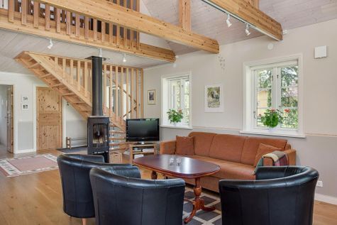 Undervåningen är öppen med ett stort allrum, kök och matplats. I anslutning till hallen finns två separata sovrum och badrum. Övervåningen har ett sovrum, toalett och ett intilliggande mindre allrum med TV-hörna och säng. Trådlöst internet finns och ingår i hyran. Städning av städbolag kan läggas till vistelsen.
