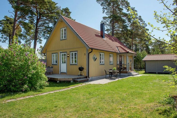 Huset har en terrass i trä som är avskild med en syrenhäck och träplank mot norr. Här finns utemöbler, parasoll och grill. En stor gräsmatta finns framöver huset där man exempelvis kan spela kubb eller badminton. Tomten är omgärdad av ett staket med grindar som kan stängas med hasp. Parkeringen är grusad och har plats för tre bilar. Intill ligger ett förråd där t.ex. väskor och golfbagar kan förvaras.