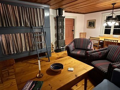 Vardagsrum med matbord, Dux-soffa, två fåtöljer samt inbyggd våningssäng (två bäddar 190 x80 cm med nya madrasser (2025); resårmadrasser av bra kvalitet + rejäla bäddmadrasser).