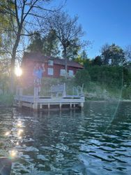 På sjösidan av huset finns egen båt/badbrygga med badstege, och en vedeldad bastu precis i vattenbrynet. Roddbåt, kanot och windsurfingbräda för juniorer/nybörjare finns att låna. (flytvästar finns)