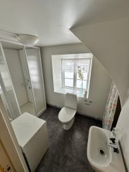 kaffebryggare och vattenkokare. Badrum med WC, tvättmaskin, handfat och duschkabin.