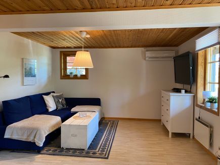 Stugan är på ca 65 m2 med kök och vardagsrum i öppen planlösning, två sovrum samt badrum. Stugan är fullt utrustad. Kök med spis, diskmaskin, mikro, kyl och frys. I badrummet finns handfat, WC, dusch, litet torkskåp samt tvättmaskin. I ena sovrummet finns dubbelsäng (180 cm bred) och i andra sovrummet finns en våningssäng (90 cm bred). 2 st extra sängplatser i bäddsoffa i vardagsrummet (140 cm bred). AC finns i vardagsrummet. Tv med Apple-tv samt DVD. En mängd DVD-filmer samt några sällskapspel finns. Inget Wi-Fi så det är internetdelning från mobilen som gäller.