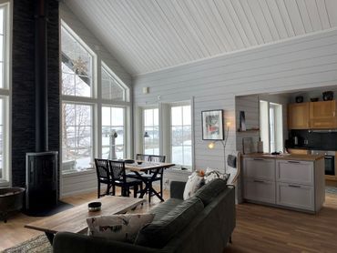 Huset har tre sovrum med plats för två personer i varje sovrum samt ett rum med skrivbord där du kan sitta och jobba vid behov. Från de båda sovrummen med dubbelsäng kan man ligga och se ut genom fönstret på den underbara fjällvärlden. Det tredje sovrummet har en våningssäng. På loftet finns ytterligare en säng. När du kommer in i hallen finns det utrymme för kläder och skor samt ett torkskåp. Huset har en öppen planlösning där storstuga och kök sitter ihop. Storstugan är den naturliga samlingspunkten där alla kan sitta och titta in i braskaminen. De två badrummen har toalett och dusch. Det ena är utrustat med tvättmaskin och det andra med bastu. Huset har fiberanslutning och TV. I intill bostadshuset finns ett omklädningsrum och förråd. I omklädningsrummet finns ytterligare ett torkskåp och "pjäxvärmare". I förrådet kan man valla skidorna.