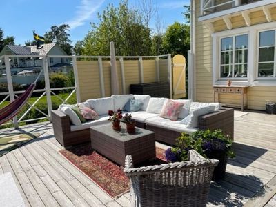 Vardagsrum: 2 soffor, 65" TV. Stor veranda med havsutsikt och sol hela dagen, perfekt för frukost i morgonsolen.