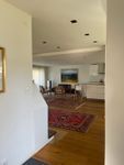 Ett stort fönsterparti vätter ut mot altanen från allrummet och den lummiga trädgården och åt gatan finns en altandörr som tar dig till frukosterrassen.