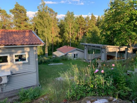 Notera att tomten är kuperad och det krävs att man kan gå i trappor. Tomten är terrasserad och det finns inga skyddsräcken förutom vid trädäcket. Husen och tomten är alltså EJ barnanpassade för små barn. Det är en del av charmen med tomten men boendet är olämplig för personer med nedsatt rörlighet eller för familjer med små barn, 1-4 år.