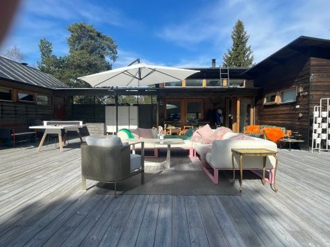 Uteplatsen har en stor terrass med gott om sällskapsytor, matplats, grillning och en vedeldad badtunna. Du kan också spela bordtennis och det finns utomhusgym – inklusive en spincykel och vikter. I trädgården finns en eldstad och sittplatser. På sommaren kan du plocka bär eller grönsaker från trädgården. Bortom viltstängslet finns en sittgrupp under träden. Sjön ligger 100 meter bort eller 200 meter om du vill använda den lilla stranden med brygga.