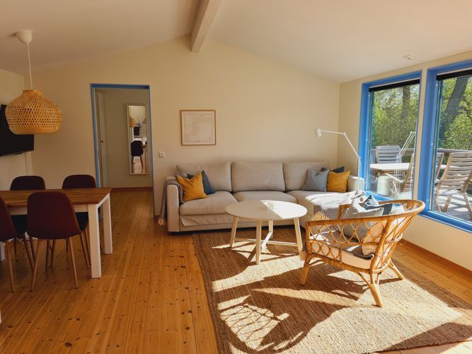 Den här stugan har 1 sovrum (m dubbelsäng 2 st 90x200), ett ljust allrum (m bäddsoffa 140 cm) och matplats och litet kök.