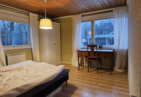 Stugan erbjuder en bekväm reträtt med två charmiga sovrum. I det första sovrummet finns en rymlig dubbelsäng samt en praktisk arbetshörna för dem som vill kombinera arbete och avkoppling. Det andra sovrummet är utrustat med en familjesäng, där den nedre bädden är 120 cm bred, perfekt för en bekväm natts sömn.