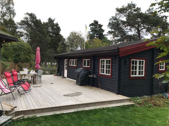Två stora trädäck med matbord, soffgrupp och ett flertal solstolar. Kolgrill.