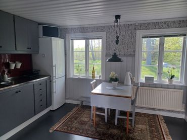 På nedervåningen finns en storstuga med matplats. Här finns en öppen spis som får användas. Ved ingår.