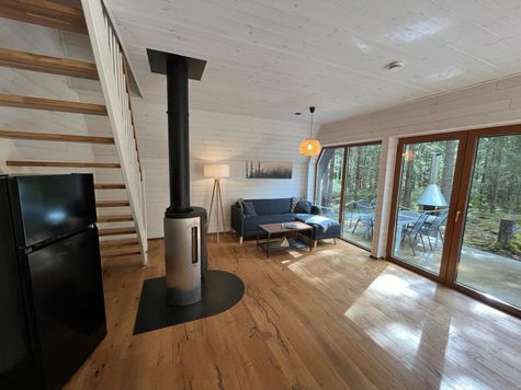 De stora fönstren fyller vardagsrummet med naturligt ljus och erbjuder en fantastisk utsikt över den omgivande naturen. En mysig öppen spis ger behaglig värme och inbjuder till avkoppling på kvällarna, medan skogens lugn utanför inbjuder till avkoppling.