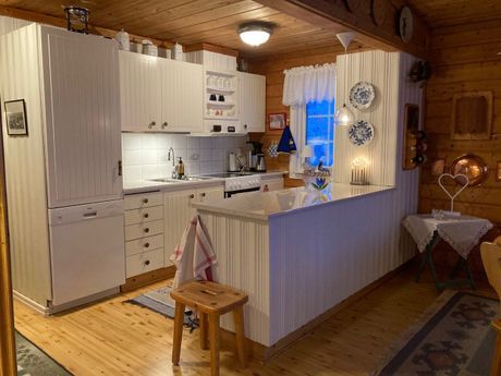 Denna mysiga fjällstuga med allrum, kök och matplats i öppen planlösning 2 sovrum innehåller också braskamin och bastu. Fullt utrustat kök med allt vad det innebär, vi utnyttjar stugan själva så basvaror finns i skåpen. I stugan finns som sagt två sovrum, det större med en ”familjesäng” 120 cm bred och 80 cm bred överslaf det mindre sovrummet med en enkelsäng. Dessutom finns ett gästhus med en dubbelsäng 160 cm.