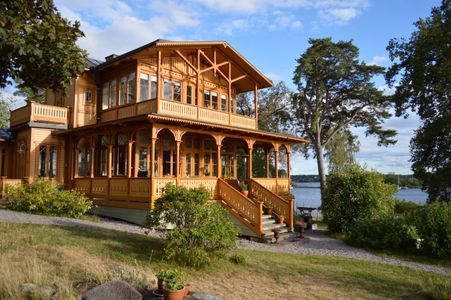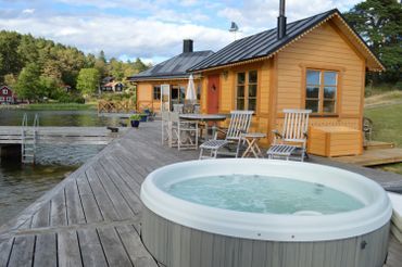 Punchpaviljong, sjöbastu och jacuzzi vid stranden. Privat brygga med segelbåtsdjup.