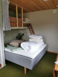 För en god natts sömn finns rullgardin vid fönstret och mörkläggningsgardin vid dörren. Takfläkt för svalka och element för värme.