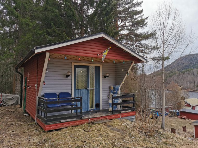 Avskild stuga ovanför värdparets hus med utsikt över sommarstugeområdet och Ångermanälven.