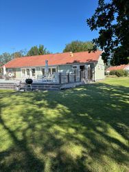 På baksidan finns ett stort trädäck (cirka 100 kvm) med solsängar, matbord, soffor, pingisbord, litet kylskåp och en pool 6,5 • 3,5 m. Poolen är uppvärmd maj-sep. I trädgården finns ett fotbollsmål och gott om plats för lek! På altanen är det sol från tidig morgon till sen kväll. En stor ek ger behaglig skugga på gräsmattan. Utsikten på baksidan är en öppen hage, där det ibland går kossor och betar. Kolgrill och muurikka med gasolbrännare finns.