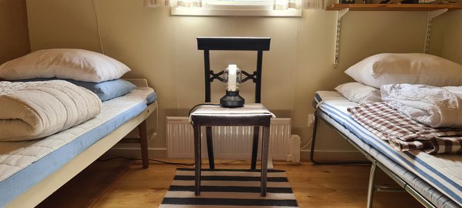Det finns två sovrum, det ena med 2 st sammanställda 90-sängar, det andra med 2 st 80-sängar lämpliga för barn, den ena är en fällsäng. Täcken och kuddar finns, gäster tar med egna sängkläder.