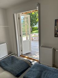 Direkt utgång till stor gemensam altan. 1 sovrum med 2 enkelsängar samt bäddsoffa i vardagsrummet.