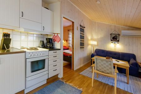 Fin stuga på 48kvm. 2 sovrum (4 bäddar), vardagsrum, kök och badrum. I vardagsrummet finns en bäddsoffa med plats för ytterligare 2 personer. Det finns diskmaskin och torkskåp.