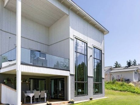 Skandinaviska Villa i två plan med panoramafönster och utsikt över skogen, en rymlig bastu och ett badkar för total avkoppling.