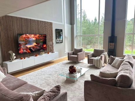 Elegant och inbjudande vardagsrum där naturen blir en del av upplevelsen. Panoramafönster släpper in ljuset och skapar rofylld atmosfär med plats för gemenskap, familjespel och att skapa minnen att bära med sig.