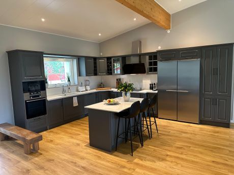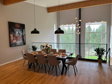 Öppen och harmonisk planlösning där kök och matplats tillsammans skapar en härlig social yta att umgås på under vistelsen.