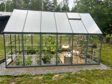Tomten på 2200 kvm är helt plan och perfekt för sommarens alla stunder – lekfulla kubbturneringar, spontana fotbollsmatcher, studsmatta för barnen eller bara skönt häng på den stora altanen, där solen ligger på hela dagen. Här finns också ett mysigt växthus som ger extra semesterkänsla. Från altanen har ni dessutom en glimt av havet.