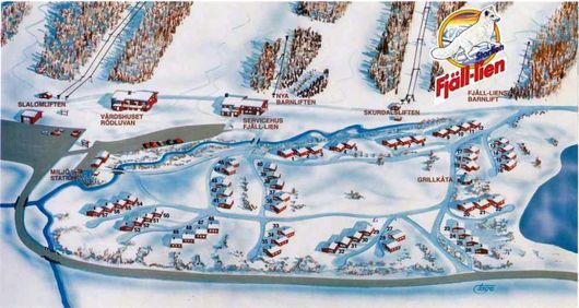 Vi har en andelsstuga på 61 m2 i Fjällien/Storlien. Totalt finns det 57 stugor sammanbyggda i längor. I stugan finns kök, storstuga, tre sovrum (plus extrabäddar i storstugan för 2 personer), hall och toalettrum med dusch.