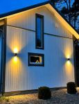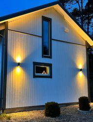 Ni möts av en belyst trappa och en liten uteplats med gräs och stenplattor vid entrén.