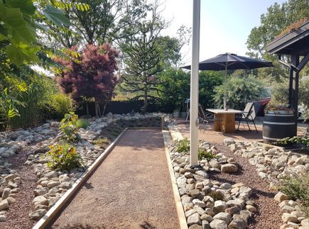 Uteplatsen med matbord, parasoll, grill och boulebana.
