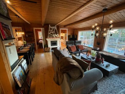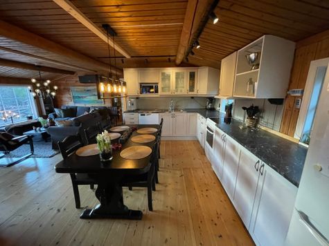 Det finns ett stort vardagsrum med öppen planlösning till köket som tillsammans erbjuder goda sällskapsytor för hela familjen. Här finns en större soffgrupp samt en otroligt fin murad öppenspis som ger skön värme i hela stugan.