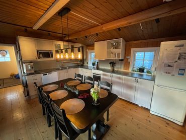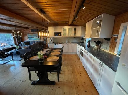 Köket har gott om arbetsbänkar och fullt modernt utrustat med allt du behöver för goda middagar, spela spel & mysiga hemmakvällar.